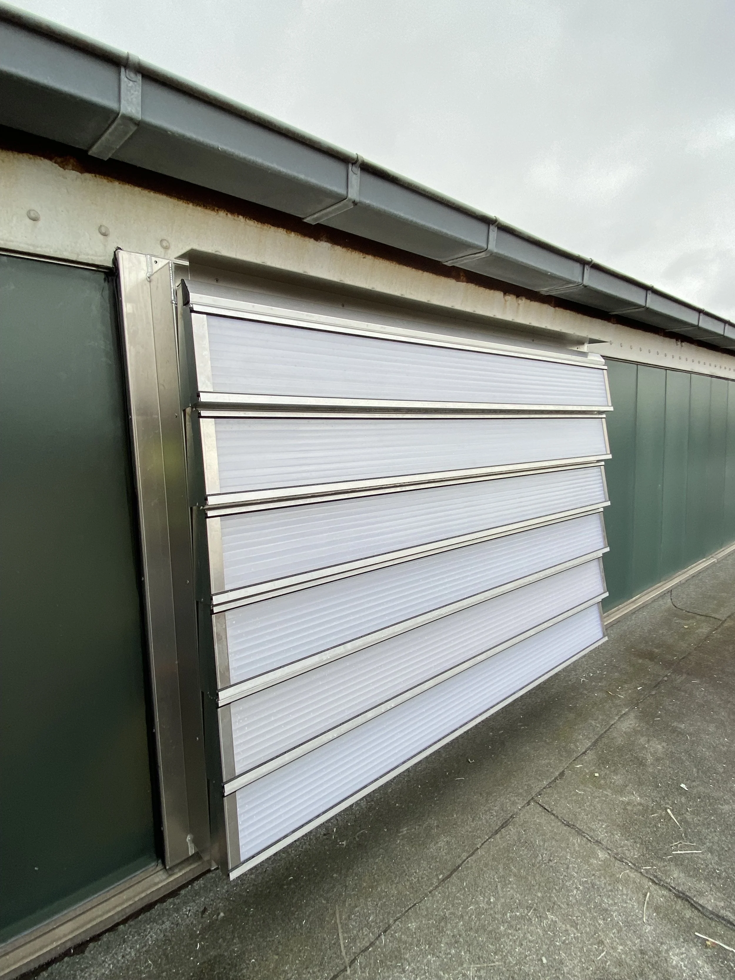 Die pneumatische Steuerung erfolgt über Doppelrohrleitung und Betriebsdruck (Pressluftanschluss). Das Öffnen und Schließen von Schlechtwetter- (regensicher) und Schönwetterklappe im Allwetterlüftererlaubt die gezielte und bedarfsgerechte Lüftung. Eine angeschlossene Wetterstation mit Wind- und Regensensor garantiert die sichere Funktion und verhindert das Eindringen von Regen.